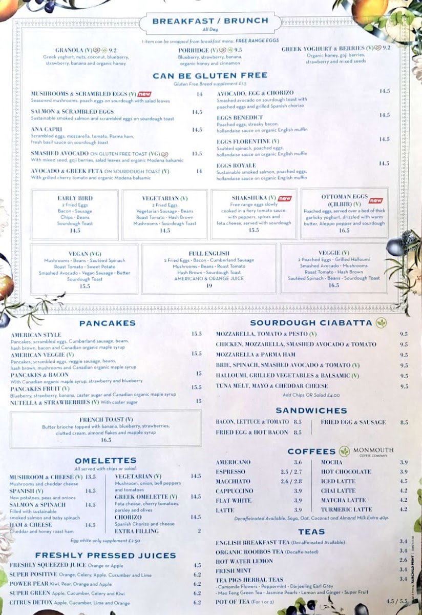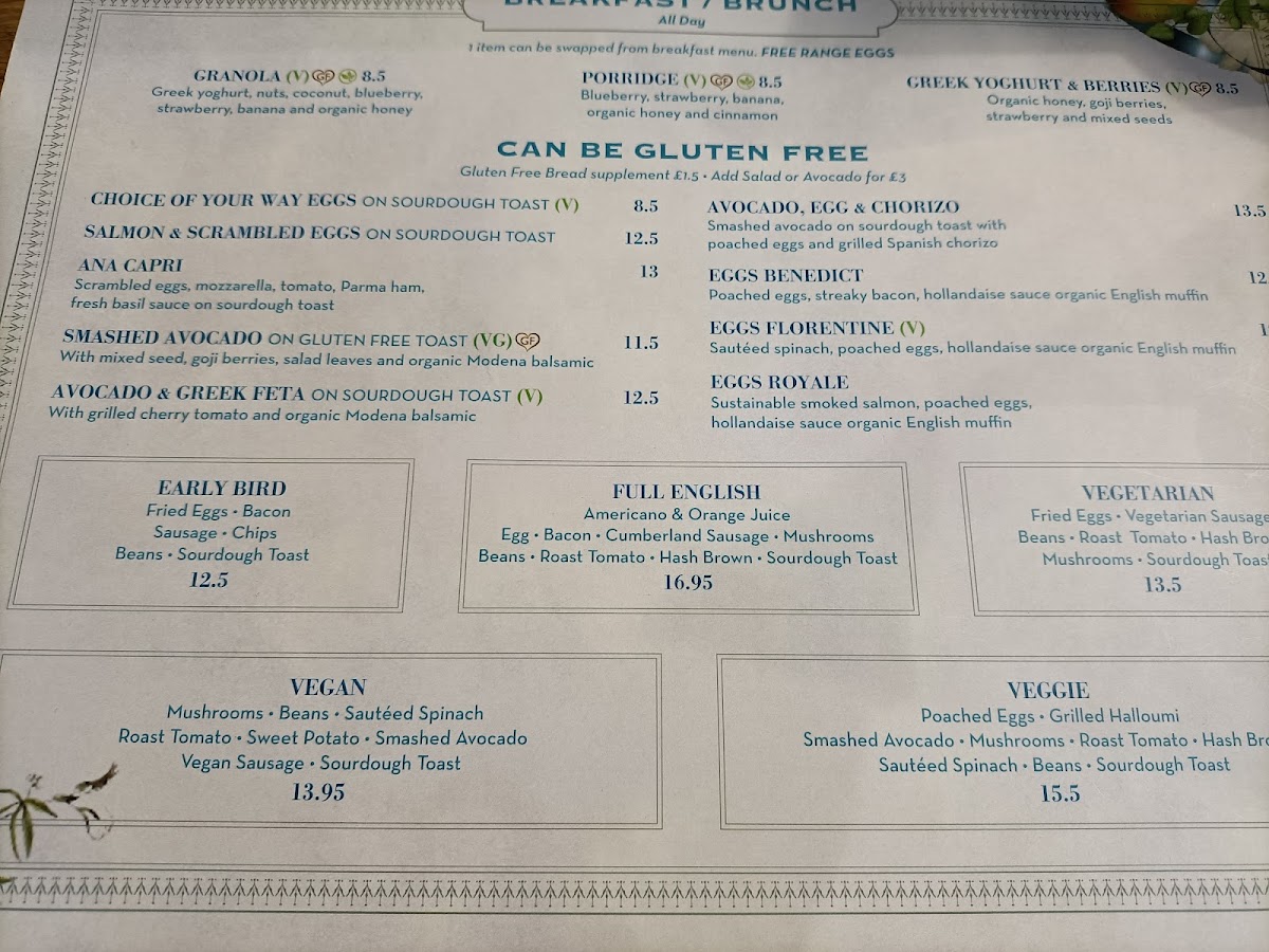 The menu offers a range of options primarily focused on breakfast and brunch, featuring both traditional and contemporary dishes. It includes classic breakfast plates such as fried eggs with bacon, sausage, chips, beans, and sourdough toast, as well as variations of eggs Benedict and eggs Royale. Lighter and fresh options like garden salad, avocado toast with feta, and granola are also available.